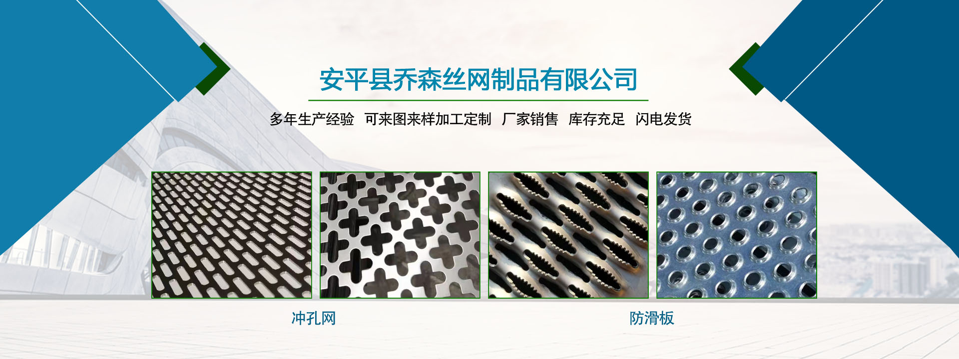 安平縣喬森絲網制品有限公司主營產品:篩網、金屬裝飾網、沖孔網板、防滑板和軋花網。常年現貨供應45號黑鋼絲編織篩網、熱鍍鋅鋼絲篩網、304不銹鋼篩網和冷鍍鋅鐵絲網,加工定做耐磨65號錳鋼絲篩網、菱形孔防堵篩網、養殖用長方孔鐵絲網、金屬裝飾網、盤條